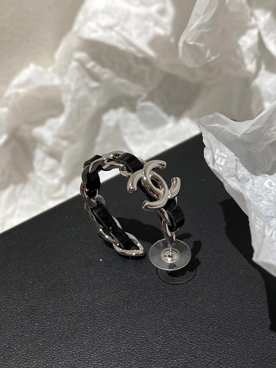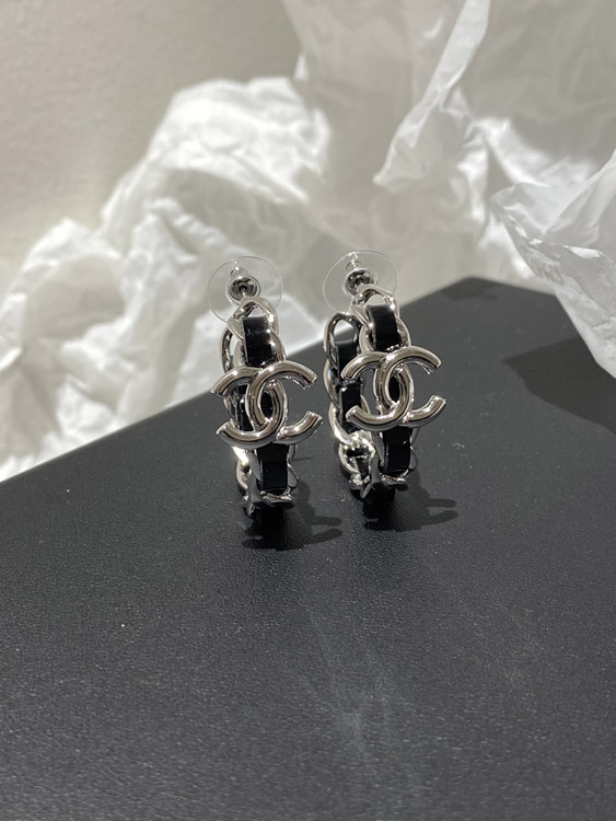 Chanel silver leather hoop earrings-3596